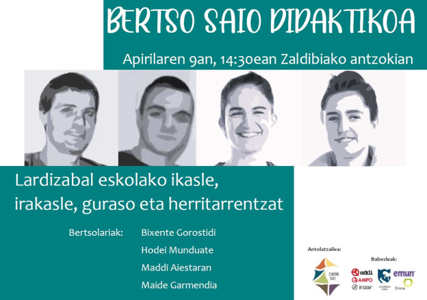 Apirilaren 9an, 14:30ean, Bertso saio didaktikoa egingo dute Zaldibiako Herri Antzokian, Zapiak Bat elkarteak antolatuta. Bertsolariak: Bixente Gorostidi, Hodei Munduate, Maddi Aiestaran eta Maide Garmendia.