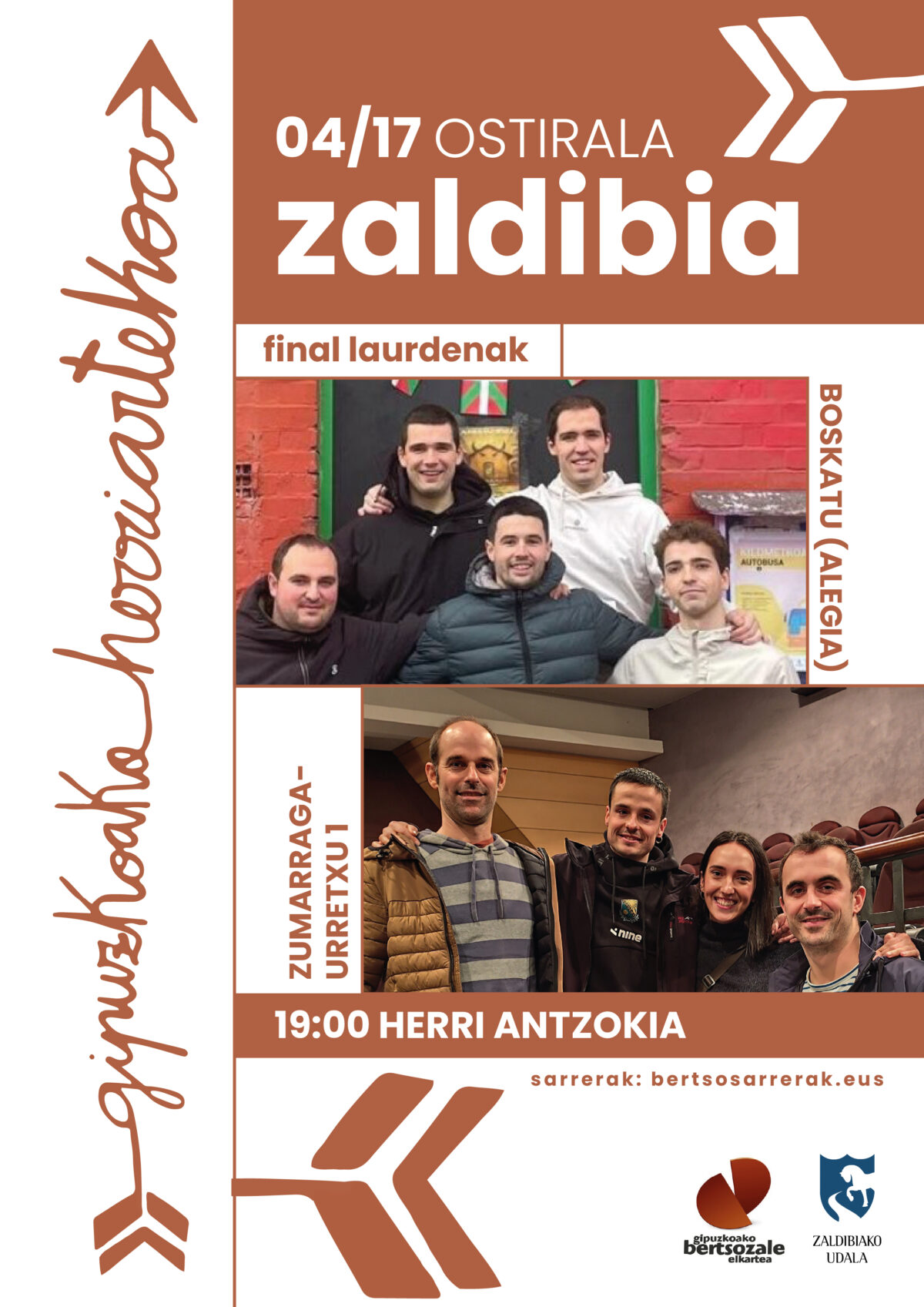 Apirilaren 17an, 19:00etan, Gipuzkoako Herriarteko Bertsolari Txapelketaren Goierri eta Tolosaldearen arteko finala jokatuko da Zaldibiako Herri Antzokian. Taldeak: Zumarraga-Urretxu 1 (Goierri) eta Boskatu (Alegia, Tolosaldea).