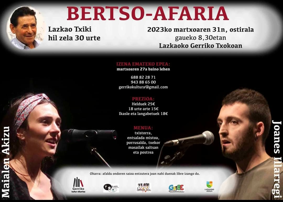 Martxoaren 31n, 20:30ean, Lazkao Txiki hil zela 30 urte bete direla gogoratzeko bertso afaria egingo dute Lazkaoko Gerriko Txokoan. Bertsolariak: Maialen Akizu eta Joanes Illarregi.