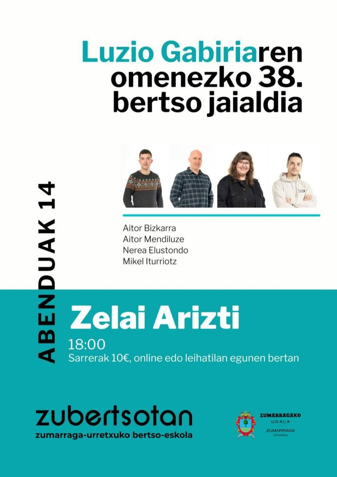 Abenduaren 14an, 18:00etan, Luzio Gabiriaren omenezko 38. bertso jaialdia egingo dute Zumarragako Zelai Arizti aretoan. Bertsolariak: Aitor Bizkarra, Aitor Mendiluze, Nerea Elustondo eta Mikel Iturriotz.
