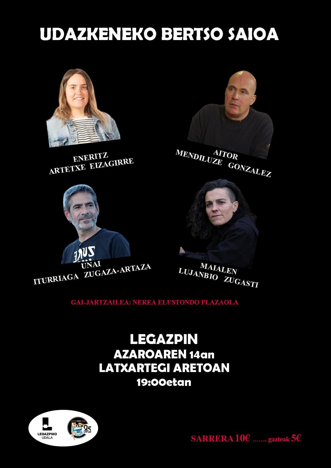 Unai Iturriaga eta Maialen Lujanbio, urriaren 5ean, Zaldibiako festetan.Lide Egizala Azaroaren 14an, 19:00etan, Udazkeneko bertso saioa egingo dute Legazpiko Latxartegi aretoan, Bertso Olariak elkarteak sustatuta. Bertsolariak: Aitor Mendiluze, Unai Iturriaga, Eneritz Artetxe eta Maialen Lujanbio.
