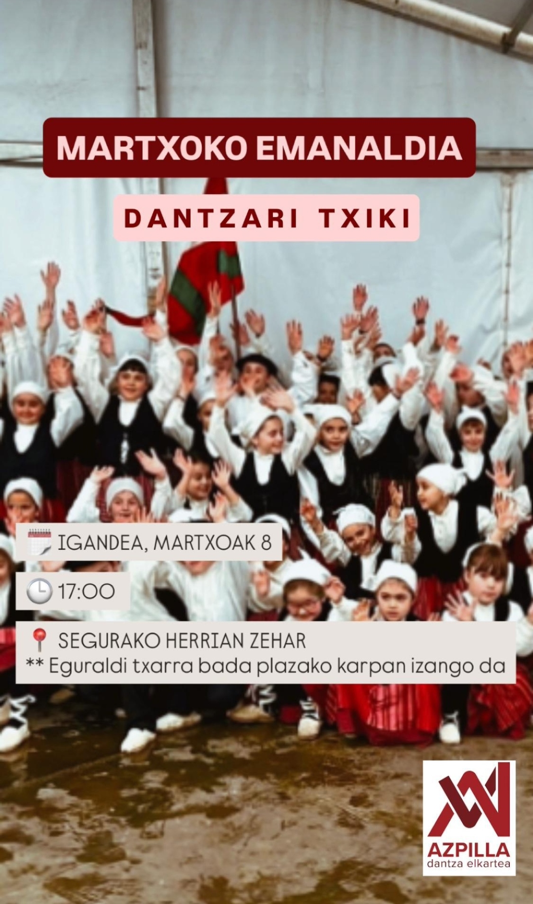 Segurako Azpilla dantza taldeko txikiak, joan den larunbateko emanaldian. Tere Madinabeitia Martxoaren 8an, 17:00etan, Segurako Azpilla dantza taldeak emanaldia egingo du herriko plazan.
