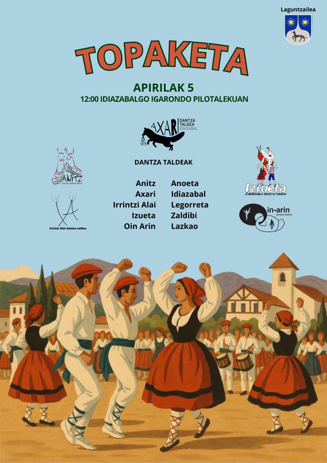 Apirilaren 5ean, 12:00etan, Axari Dantza Taldeak antolatutako Herri Arteko Dantza Topaketa egingo da Idiazabalgo Igarondo pilotalekuan. Bost dantza talde ariko dira: Igarondo pilotalekuan: Anitz (Anoeta), Axari (Idiazabal), Irrintzi Alai (Legorreta), Iztueta (Zaldibia) eta Oin Arin (Lazkao).