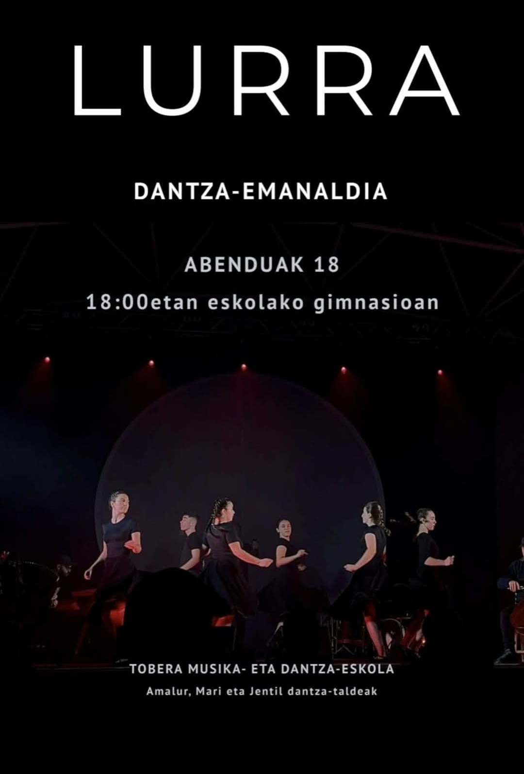 Abenduaren 18an, 18:00etan, Lurra dantza emanaldia egingo dute Tobera dantza taldeko Amaiur, Mari eta Jentil taldeek Zegamako Aitxuri eskolako gimnasioan.