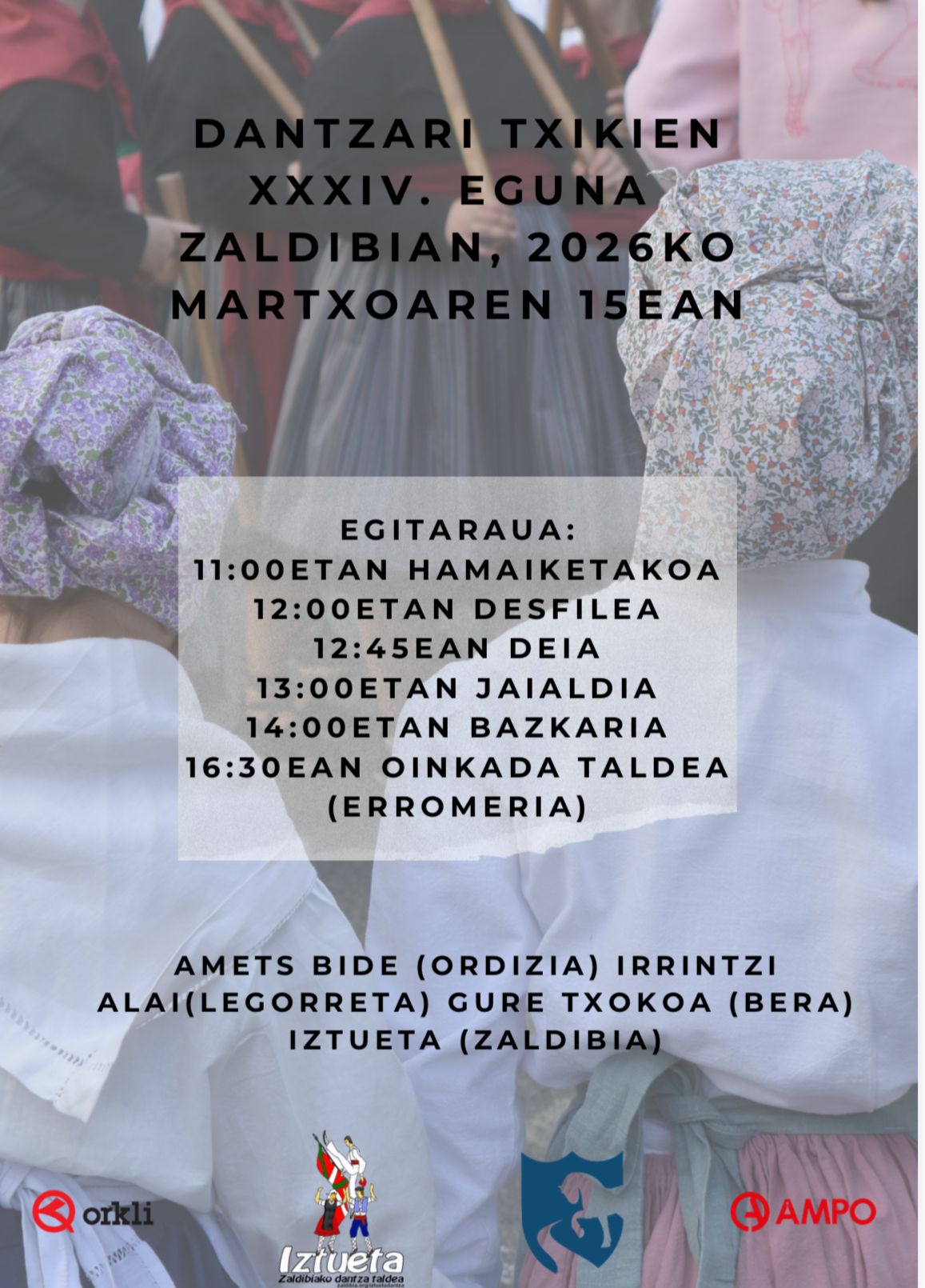 Martxoaren 15ean, 11:00etan, Zaldibiako Dantzari Txikien 34. Eguna ospatuko dute herrigunean eta plazan, Zaldibiako Iztueta dantza taldeak antolatuta. Taldeak: Amets Bide (Ordizia), Irrintzi Alai (Legorreta), Gure Txokoa (Bera) eta Iztueta (Zaldibia).