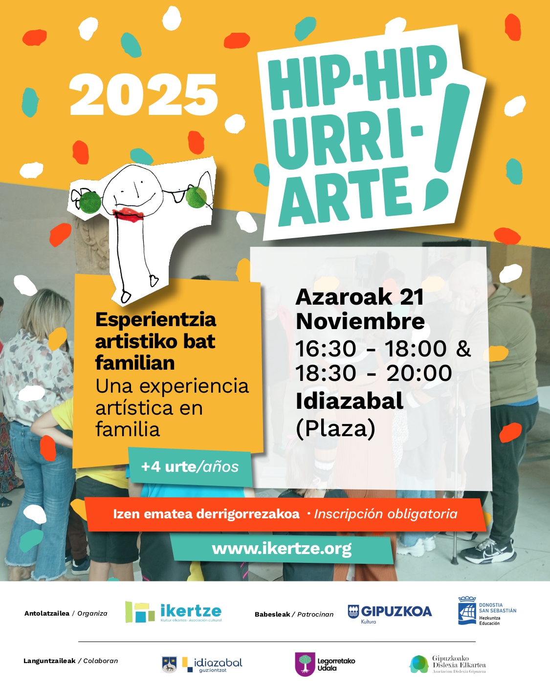 Azaroaren 21ean, 16:30ean eta 18:30ean, Hip Hip urri arte! esperientzia artistikoa egingo dute Idiazabalgo Plaza Nagusian.