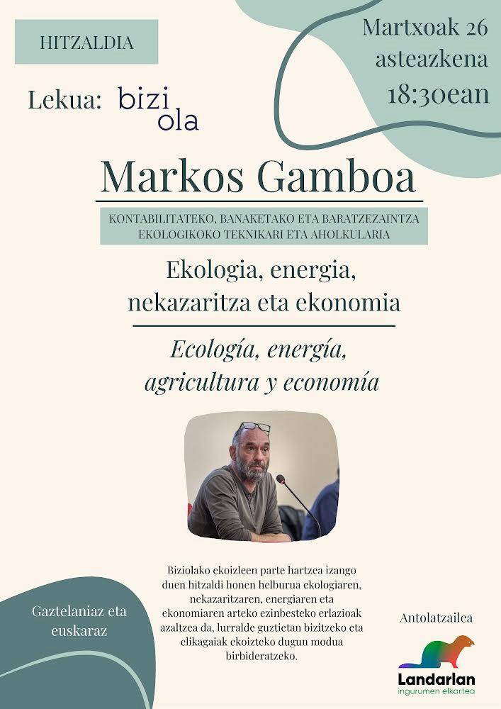 Martxoaren 26an, 18:30ean, Ekologia, energia, nekazaritza eta ekonomia hitzaldia izango da Lazkaoko Biziola fabrikan, Landarlan ingurumen elkarteak antolatuta. Hizlaria: Markos Ganboa, Kontabilitateko, banaketako eta baratzezaintza ekologikoko teknikari eta aholkularia.