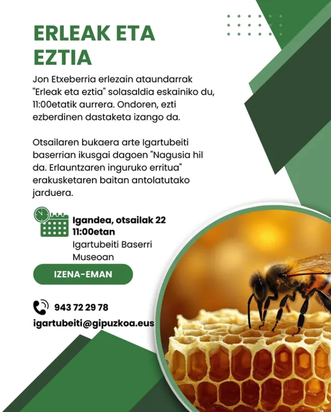 Otsailaren 22an, 11:00etan, Erleak eta eztia hitzaldia izango da Ezkioko Igartubeiti baserri-museoan. Hizlaria: Jon Etxeberria erlezaina.