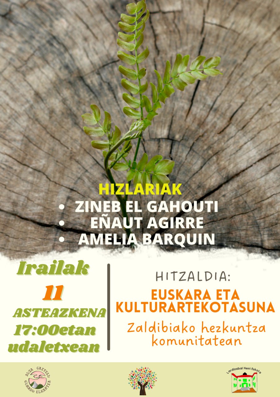 Irailaren 11n, 17:00etan, Euskara eta kultuartekotasuna Zaldibiako hezkuntza komunitatean hitzaldia izango da Zaldibiako udaletxean. Hizlariak: Zineb El Ghaouti, Eñaut Agirre eta Amelia Barquin.