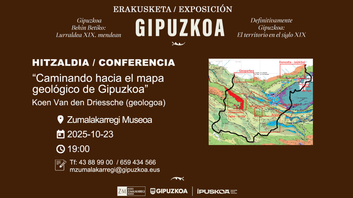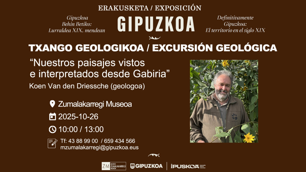 Koen Van de Driessche geologoa. Urriaren 23an, 19:00etan, Gipuzkoako mapa geologikorantz bidaiatzen hitzaldia izango da Ormaiztegiko Zumalarregi museoan, Gipuzkoa behin betikoa: Lurraldea XIX. mendean erakusketaren harira. Hizlaria: Koen Van de Driessche geologoa. Urriaren 26an (10:00-13:00) txango gidatua egingo dute Gabiriara.