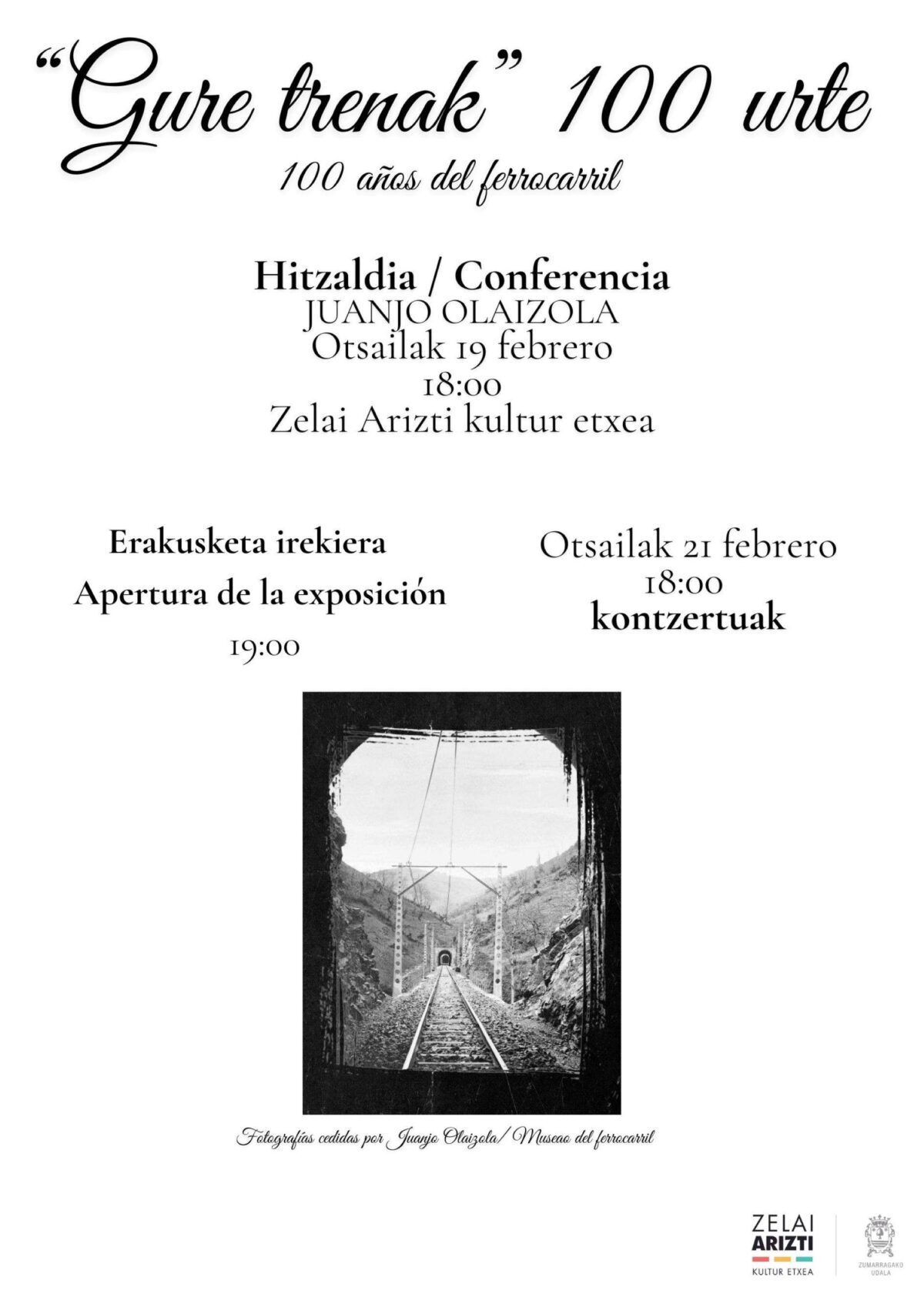Otsailaren 19an, 18:00etan, Gure trenak 100 urte hitzaldia izango da Zumarragako Zelai Arizti aretoan. Hizlaria: Juanjo Olaizola.