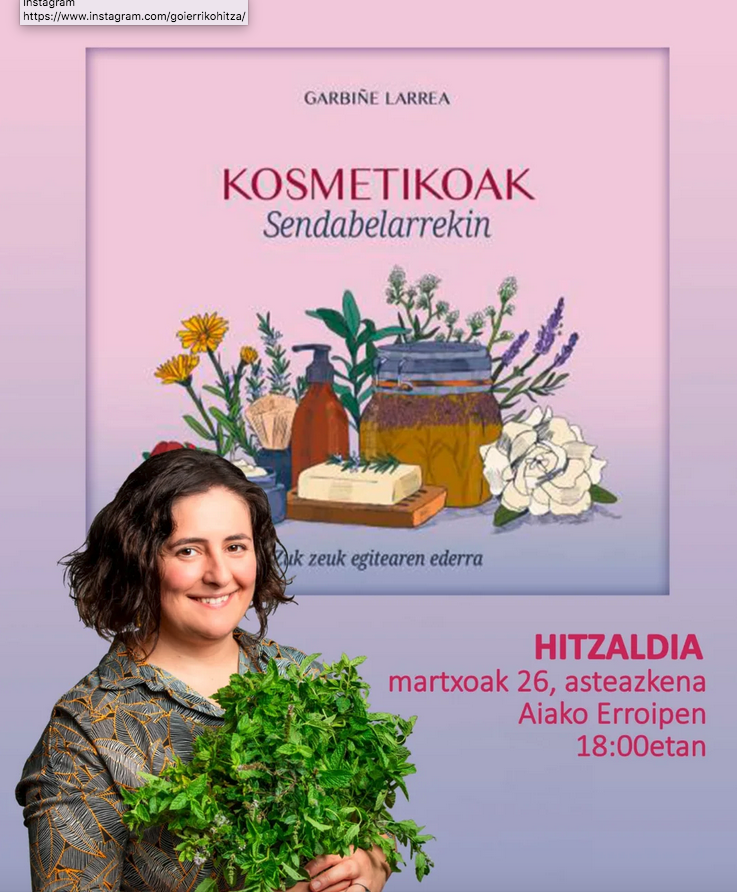 Martxoaren 26an, 18:00etan, Kosmetikoak sendabelarrekin hitzaldia izango da Ataun Aiako Erroipen. Hizlaria: Garbiñe Larrea.