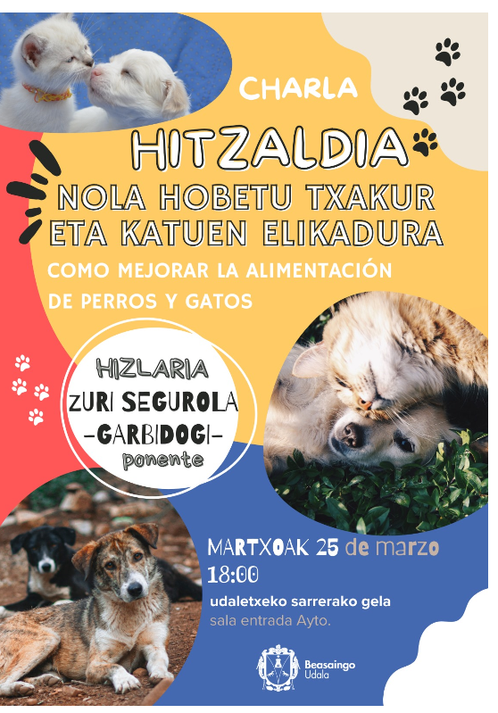 Zuri Segurola txakur batekin.Hitza Martxoaren 25ean, 18:00etan, Nola hobeto txakur eta katuen elikadura hitzaldia izango da Beasaingo udaletxeko sarrera gelan. Hizlaria: Zuri Segurola nutrizionista eta Garbidogiko arduraduna.