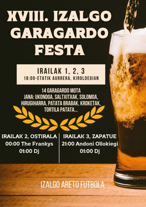 Irailaren 1etik 3ra, Idiazabalgo XVIII. Garagardo Festa ospatuko dute, Izalgo Areto Futbola taldeak antolatuta: