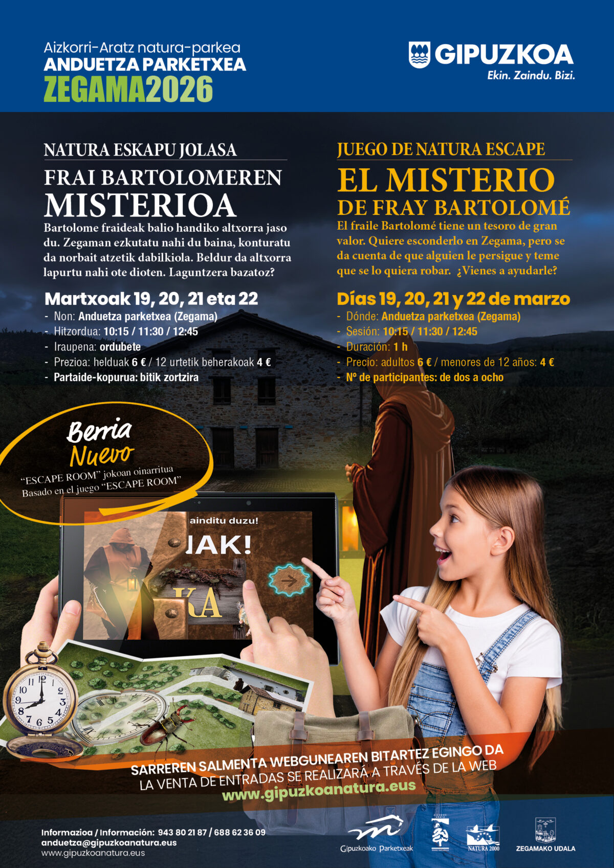 Martxoaren 19an, 20an, 21ean eta 22an, 10:15ean, 11:30ean eta 12:45ean, Frai Bartolomeren misterioa ihes jolasa naturan egingo dute Zegamako Anduetza parketxean, Escape room jokoan oinarrituta.