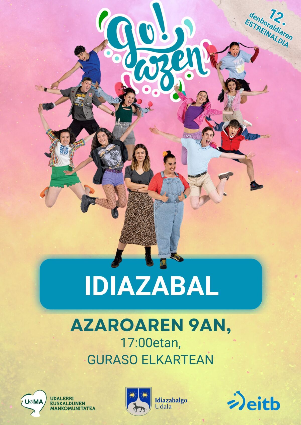 Azaroaren 9an, 17:00etan, Go!azen 12.0 telesailaren lehen kapituluaren estreinaldia egingo dute Idiazabalgo Guraso Elkartean.