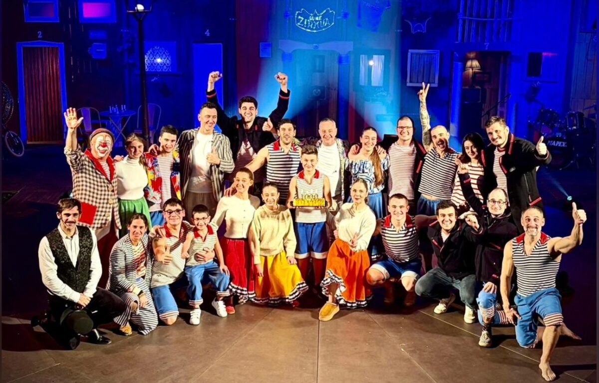 Gure Zirkuko kideak mila emanaldira iritsi direla ospatzeko taldeko argazkian, iazko abenduan. Gure Zirkua Apirilaren 30ean, 18:00etan, Gure Zirkuak emanaldia egingo du Olaberrian.