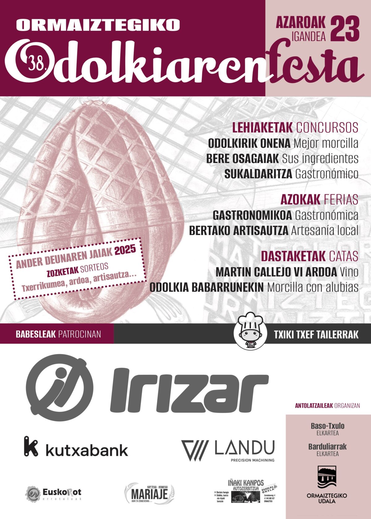 - 10:00. Ormaiztegiko 38. Odolki Lehiaketa, 27. Odolki Osagaien lehiaketa, eta 23. plateren sukaldaritza lehiaketa, plazako karpan. Sukaldaritzan banaka edo lau lagunera arteko taldeetan parte har daiteke; 14 urtetik gorako ormaiztegiarrentzat da; platera 11:00etarako aurkeztu behar da; odolkia eduki behar du nahitaezko osagaitzat. Juan Jose Lapitz Saria: otordua Eskola Zaharrak tabernan.