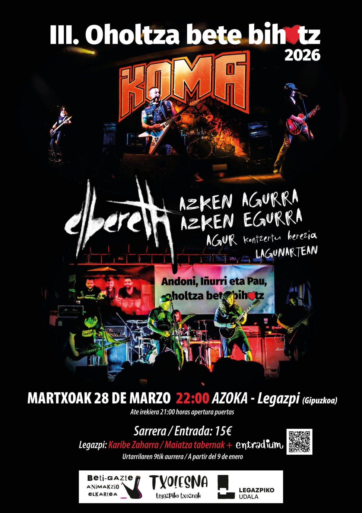 Elbereth taldea, 'Omen' bosgarren diskoaren promoziorako irudian. Iñigo Peñagarikako Martxoaren 28an, 22:00etan, Koma eta Elbereth (Azken agurra) taldeek Oholtza bete bihotz kontzertuan joko dute Legazpiko Azokan.