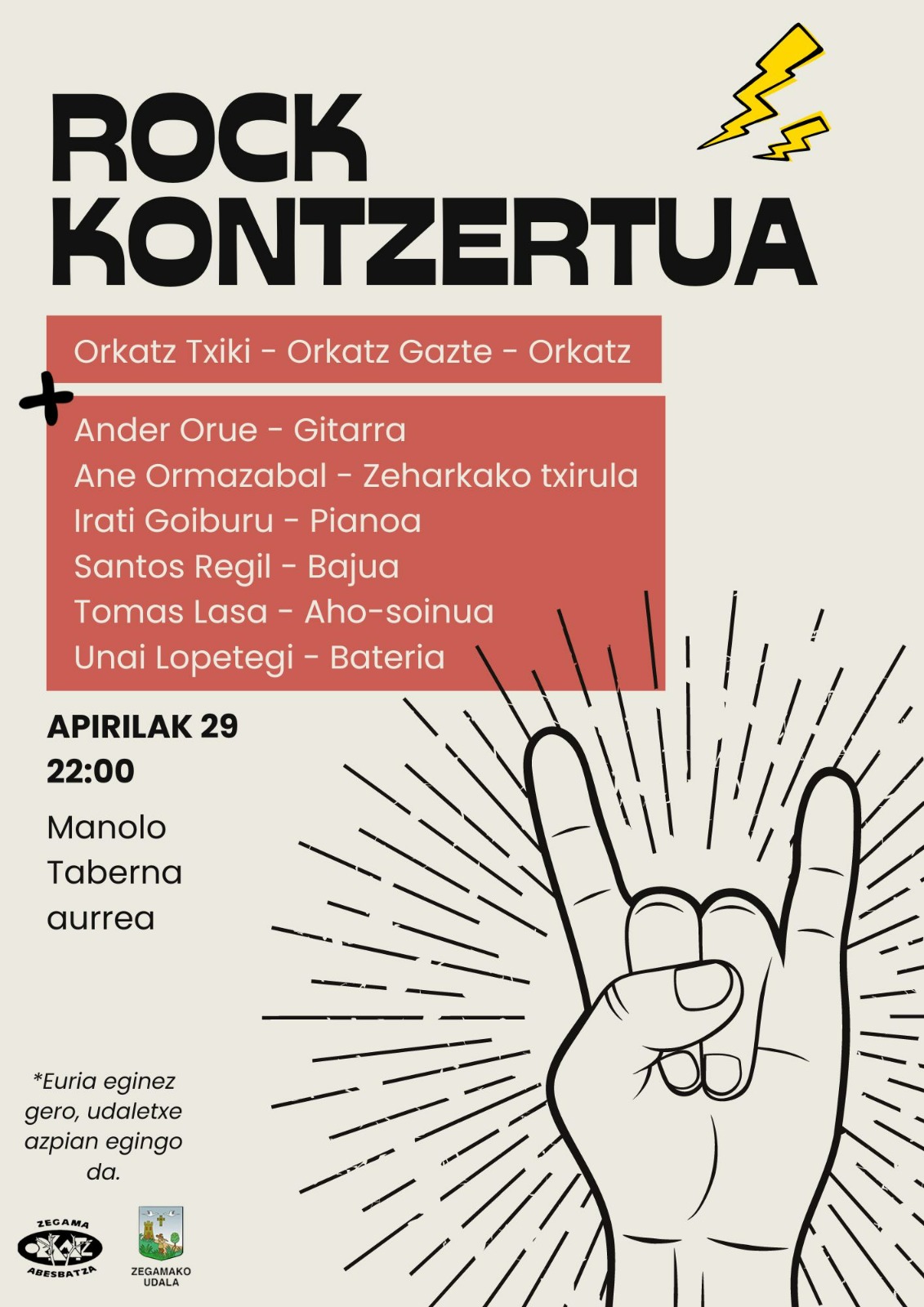 Apirilaren 29an, 22:00etan, Rock kontzertua izango da Zegamako Manolo tabernaren aurrean. Orkatz Txiki, Orkatz Gazte eta Orkatz abesbatzek, eta Ander Orue (gitarra), Aner Ormazabal (Zeharkako txirula), Irati Goiburu (pianoa), Santos Regil (pianoa), Tomas Lasa (aho-soinua) eta Unai Lopetegi (bateria) musikariek hartuko dute parte.
