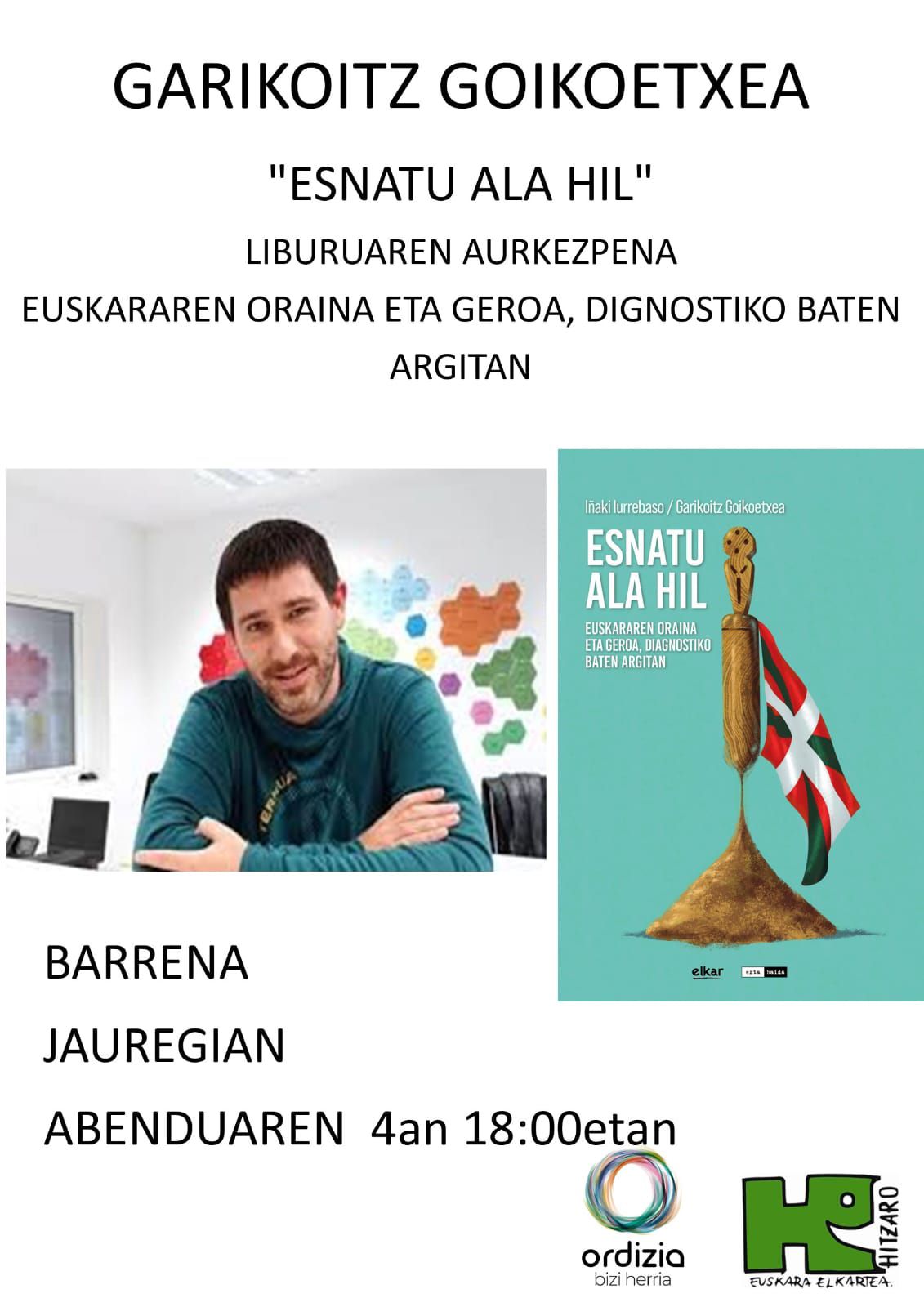 Abenduaren 4an, 18:00etan, Garikoitz Goikoetxeak Esnatu ala hil. Euskararen oraina eta geroa, diagnostiko baten argitan liburua aurkeztuko du Ordiziako Barrena kultur etxean. Ondoren solasaldia egingo dute egilearekin.