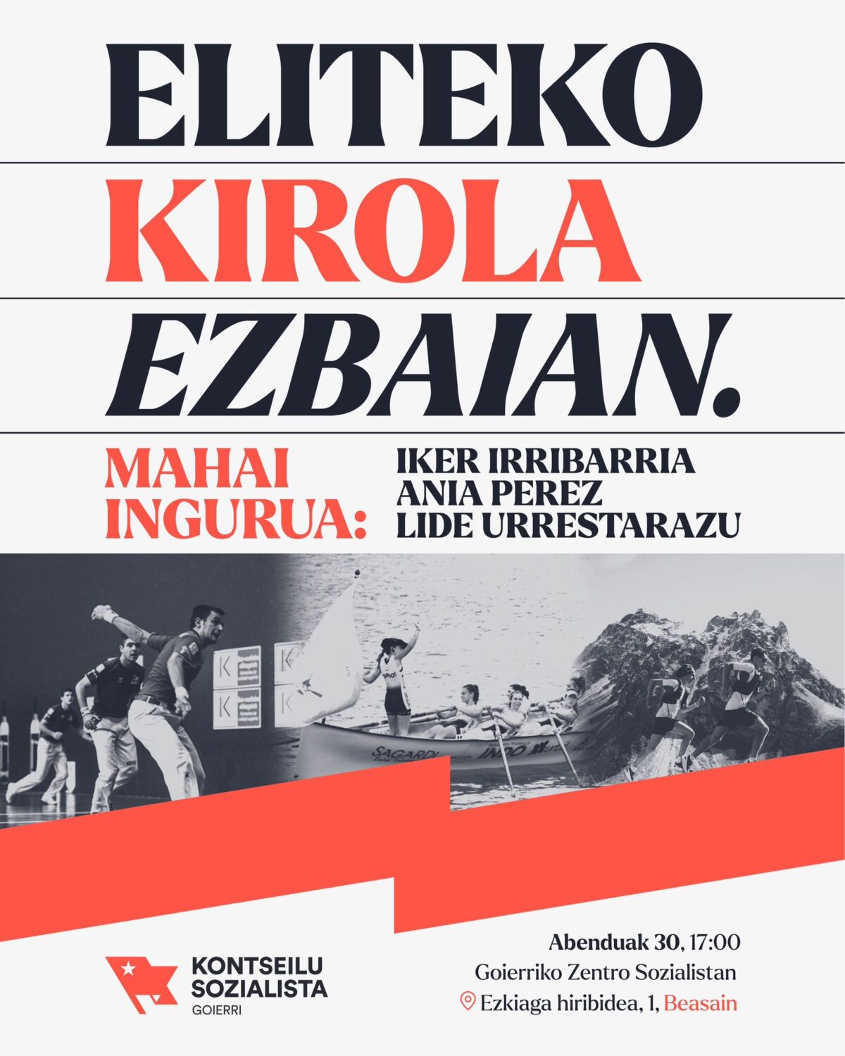 Abenduaren 30ean, 17:00etan, Eliteko kirola ezbaian mahai-ingurua egongo da Goierriko Zentro Sozialistan, Beasainen. Partaideak: Iker Irribarria pilotari ohia, Ania Perez arraunlaria eta Lide Urrestarazu mendi korrikalaria.