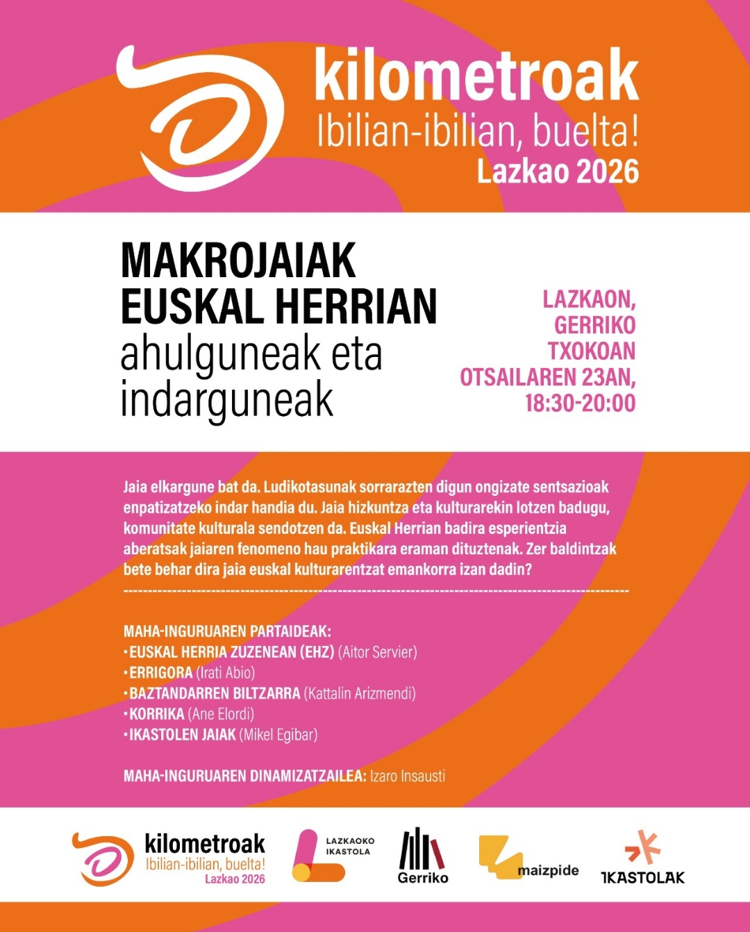 Kilometroak Txikia ari dira ospatzen Lazkaon.Mikel Albisu. Otsailaren 23an (18:30-20:00) Makrojaiak Euskal Herrian. Ahulguneak eta indarguneak mahai-ingurua egingo dute Lazkaoko Gerriko Txokoan. 2026ko Kilometroak jaiaren harira antolatu dute.