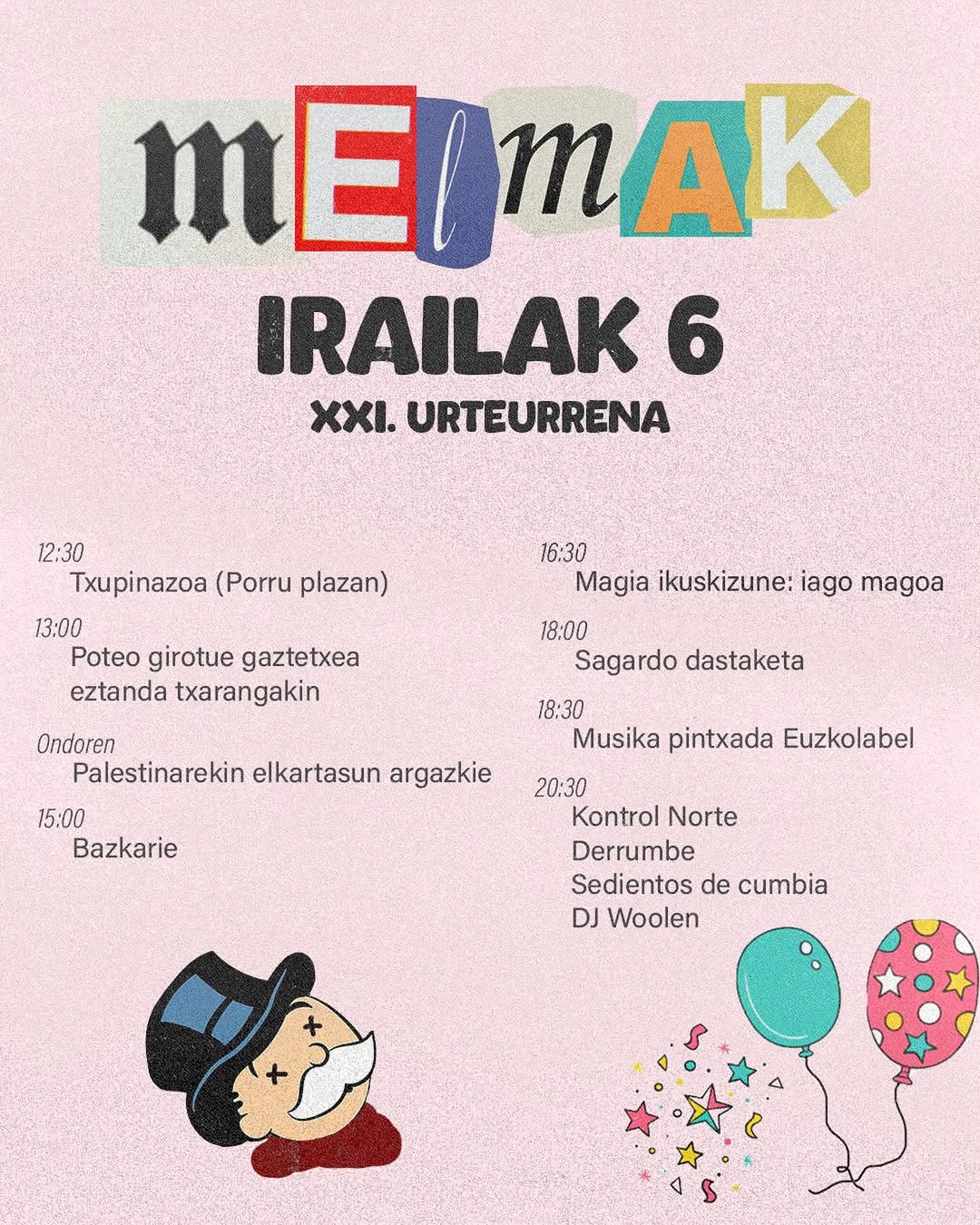 - 20:30. Kontzertuak: Kontrol Norte, Derrumbe, Sedientos de cumbia eta DJ Woolen