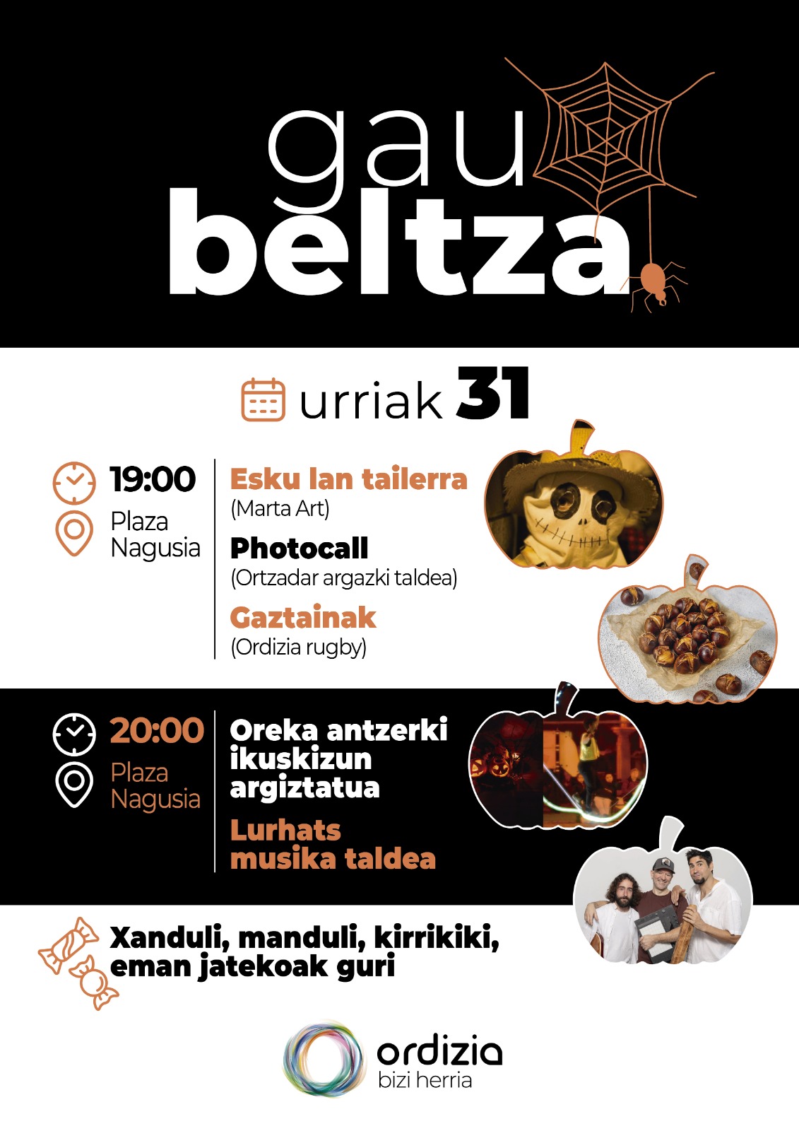 Urriaren 31n, 19:00etan hasita, Gau Beltza ospatuko dute Ordiziako Plaza Nagusian. Eskulan tailerra, photocall-a, gaztaina jatea, Oreka ikuskizun argiztatua eta Luharts musika taldea izango dira, besteak beste.