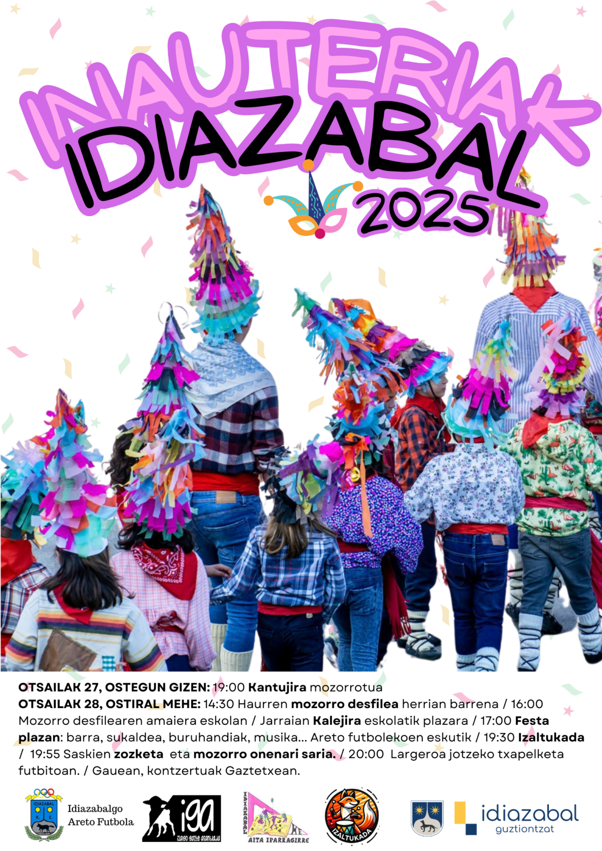Otsailaren 27an eta 28an Inauteriak ospatuko dituzte Idiazabalen. Guraso Elkarteak, Areto Futboleko Taldeak eta Gaztetxeak bat egiten dute egitaraua osatzeko.