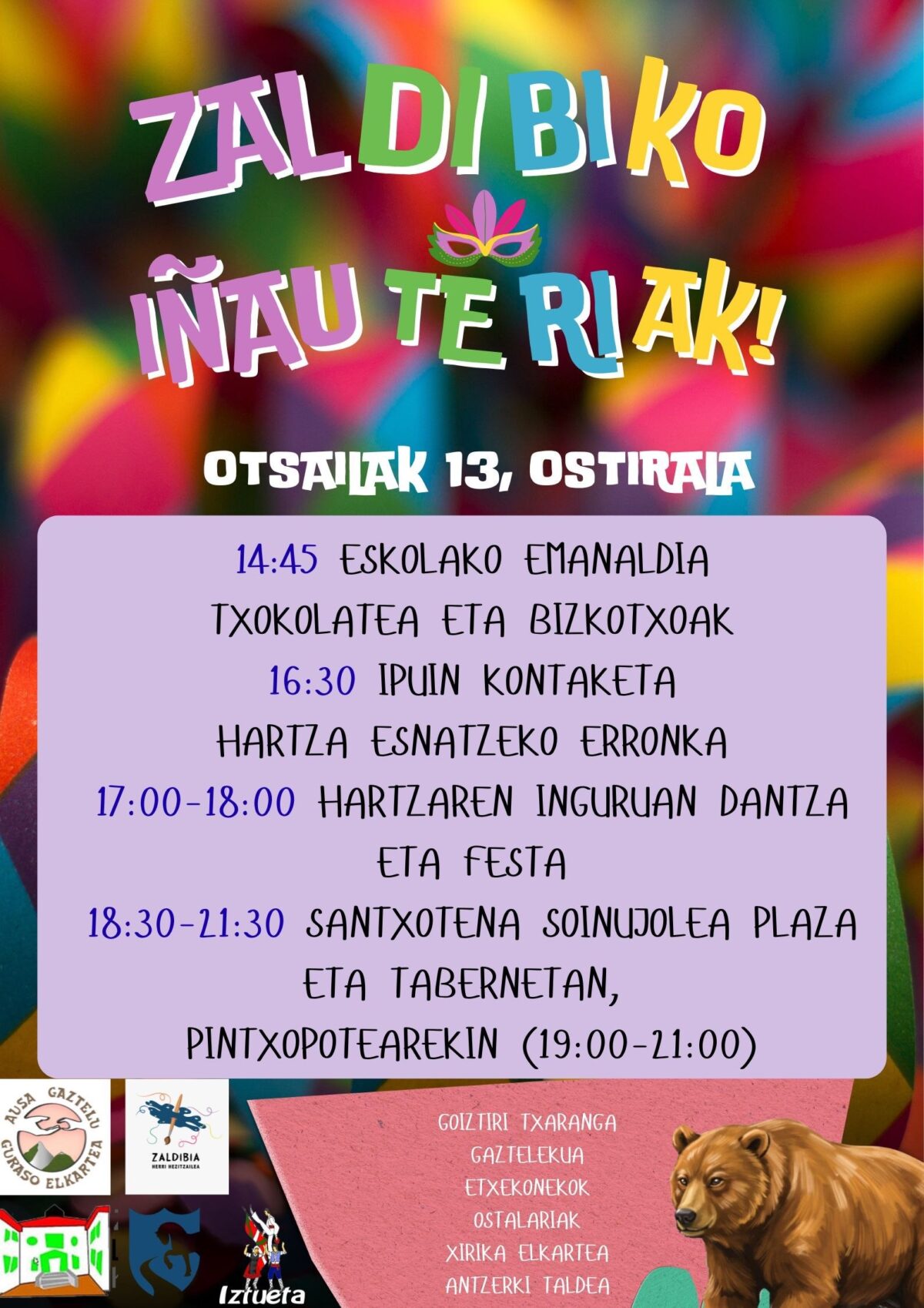 - 16:30-18:00. Herriko txaranga; Ipuin kontaketa (Hartza eta Inauterien gaiaren ingurukoa); Hartzaren esnatze eta erakartze erronka; Hartza gerturatzean: neguari agurra, hartzaren inguruan dantza eta Inauteriaren ospakizuna.