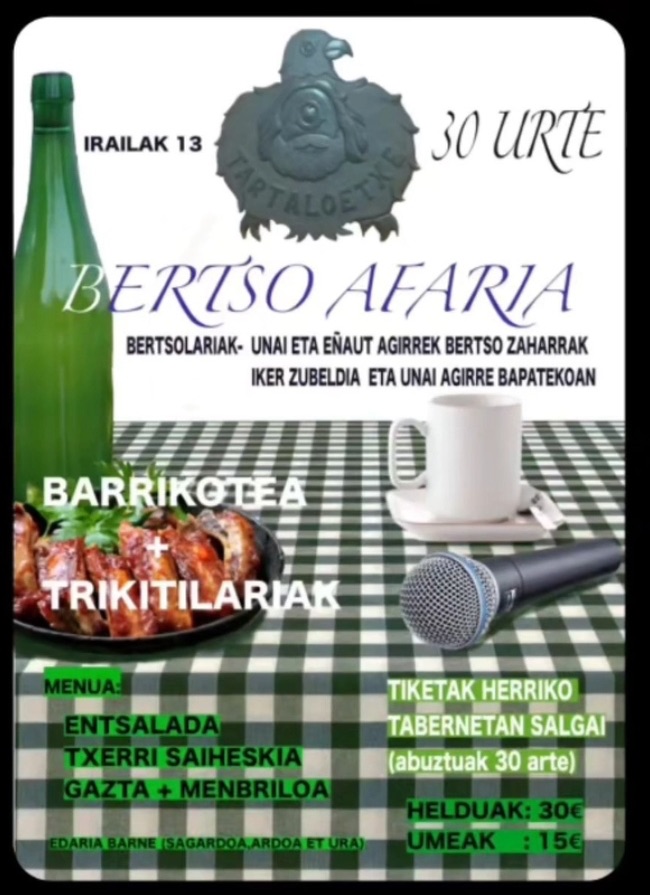 Irailaren 13an Zegamako Tartaloetxe elkarteak 30. urteurreneko ospakizuna egingo du bertso afari baten bidez. Unai eta Eñaut Agirre anaiek bertso zaharrak kantatuko dituzte, eta Iker Zubeldia eta Unai Agirre bat-batean ere ariko dira.