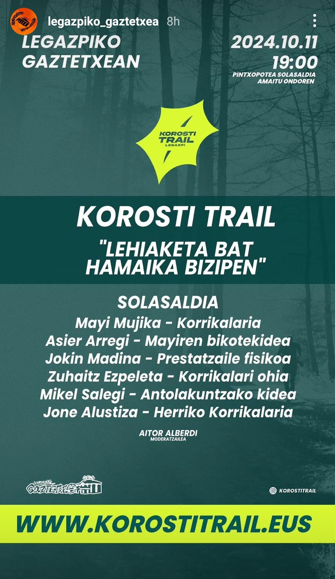 Urriaren 11n, 19:00etan, Korosti trail. Lehiaketa bat hamaika bizipen solasaldia izango da Legazpiko Gaztetxean. Hizlariak: Mayi Mujika (Korrikalaria), Asier Arregi (Mayiren bikotekidea), Jokin Madina (Prestatzaile fisikoa), Zuhaitz Ezpeleta (Korrikalari ohia), Mikel Salegi (Antolakuntzako kidea) eta Jone Alustiza (Herriko korrikalaria).
