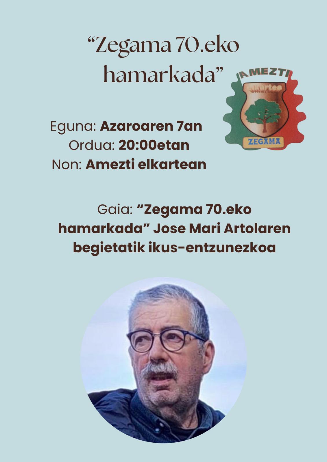 Azaroaren 7an, 20:00etan, Jose Mari Artolak bildutako irudiekin ondutako Zegama 1970eko hamarkadan izango da Amezti elkarteak antolatutako Udazkeneko tertulia afariak saioko gaia.