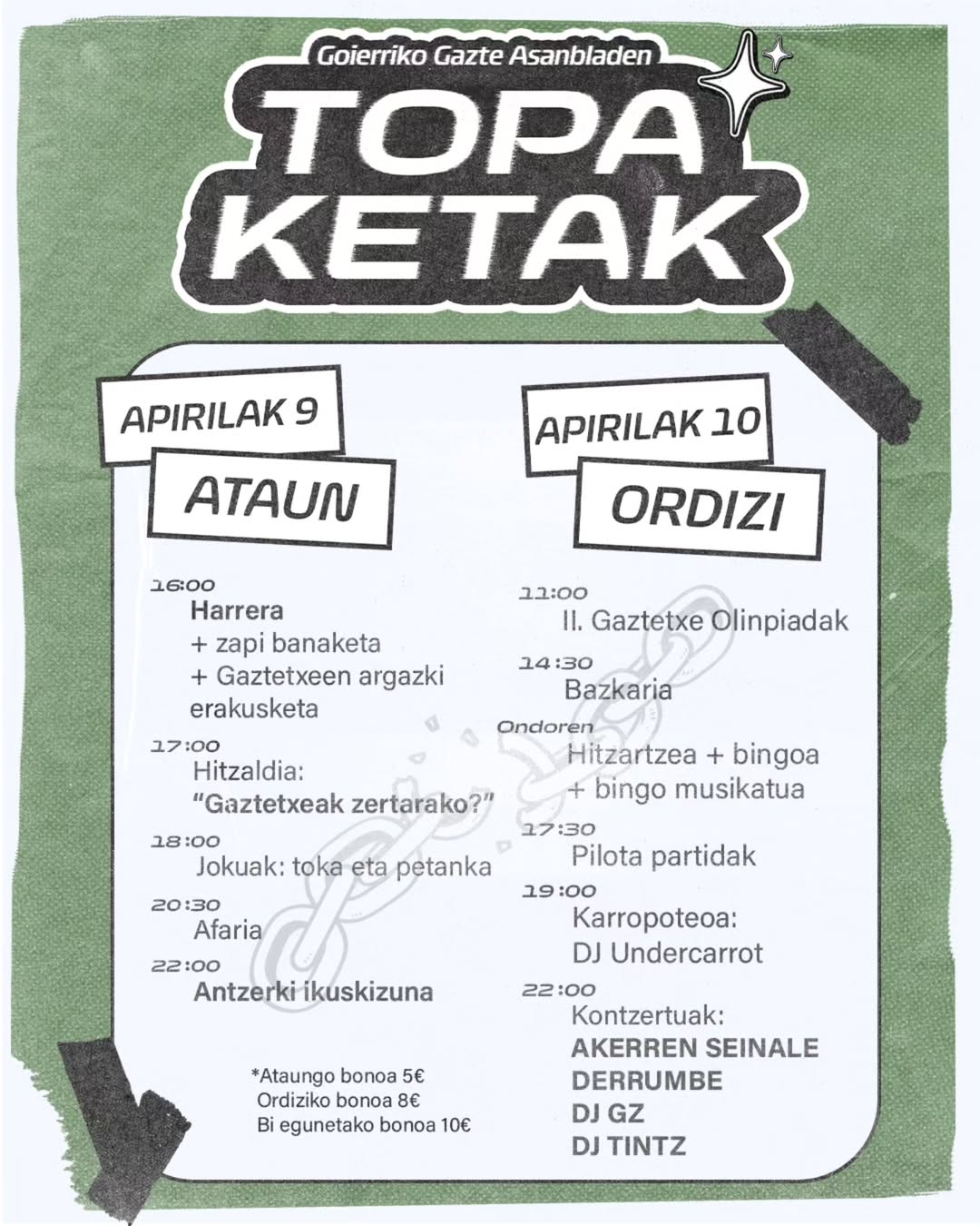 - 22:00. Kontzertua: Akerren seinale, Derrumbe, DJ GZ eta EJ Tintz