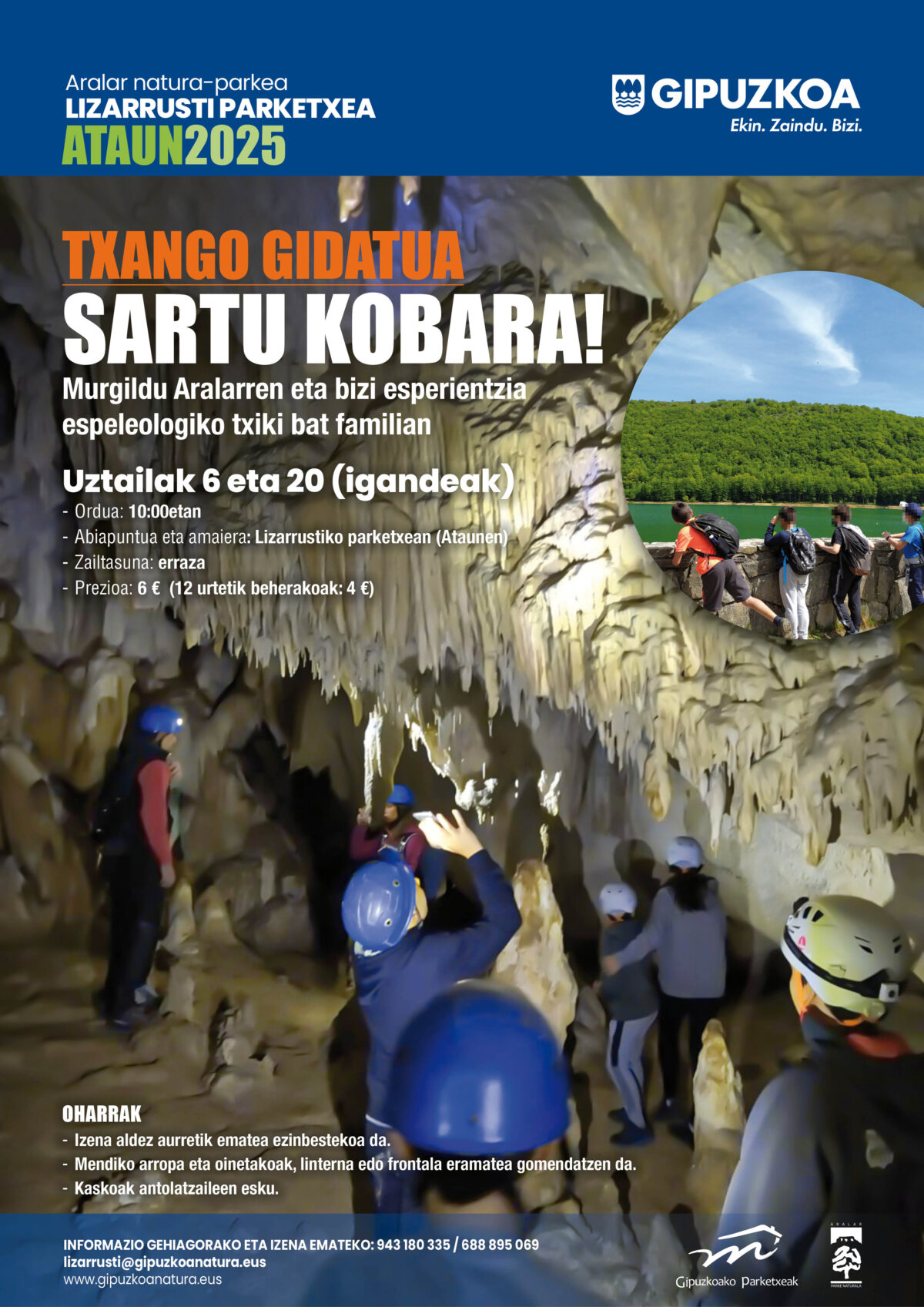 Lareo ondoko kobara egindako espeleologia irteeraren irudi bat. Uztailaren 20an, 10:00etan hasita, Sartu kobara! txango gidatua izango da Lizarrustiko parketxetik abiatuta.