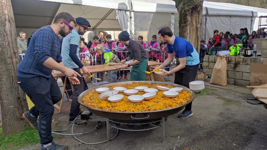 Paella bazkari herrikoia egin dute Idiazabalen, San Blas egunez. 90 kiloz arroz erabili dituzte bi paella handi egin eta 800 herritarri bazkaltzen emateko.